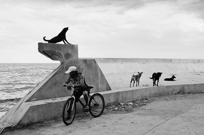 When asked to pick his favorite photo, the street photographer admitted, “I couldn’t choose just one—many of them hold deep meaning for me.” However, he did share a special favorite: a silhouette of a dog against a golden Dumaguete sunrise, standing like a silent guardian by the sea. He explained: